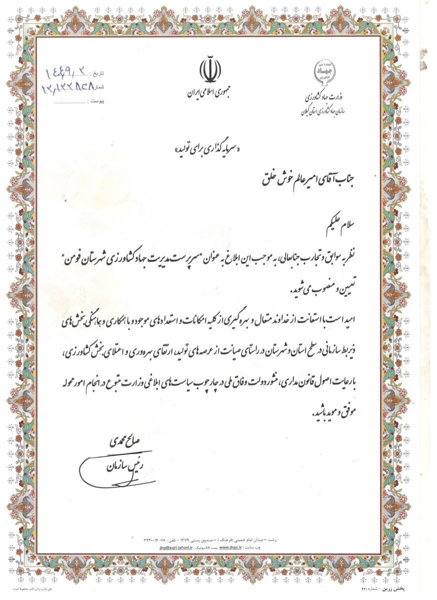 ابلاغ مدیر جهاد کشاورزی شهرستان فومن