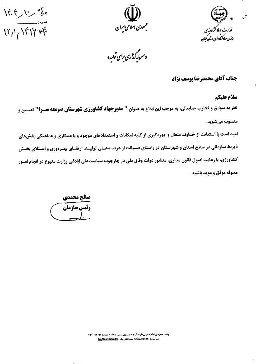 ابلاغ مدیر جهاد کشاورزی شهرستان صومعه سرا